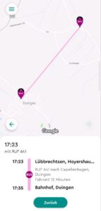 Da mobil@leine Teil des ÖPNV ist, werden Dir bei der Fahrtensuche auch „normale“ Busfahrten angeboten, damit keine unnötigen Parallelfahrten zwischen Linienbussen und mobil@leine entstehen.
